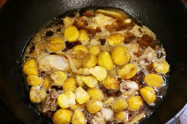 3.炒锅烧热放入食用油,油热后把准备好的葱花放进去炒香。然后再放入准备好的鸡肉。快速的翻炒两分钟。往里面加入甜面酱、生抽、老抽、精盐调味。然后在里面加入适量的开水。把准备好的板栗加进来。
