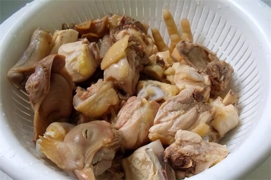 2.炒锅内加入适量的冷水,把准备好的鸡肉加进来。放入葱姜去腥。不用盖盖子大火烧开。水烧开后撇去里面的浮沫,然后转中火继续慢炖五分钟后捞出备用。