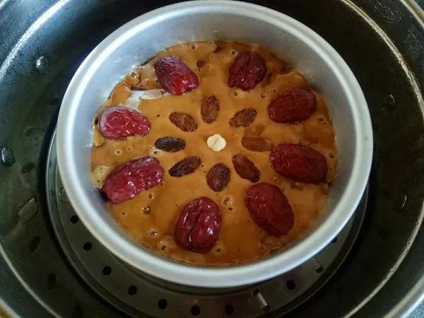 3.面团醒发好后,我们用筷子给它搅拌几下,把里面的气泡擀出来,蒸锅内加入适量清水大火烧开,把清洗好的红枣直接摆放在面团上面。开水上锅蒸35分钟就可以了。