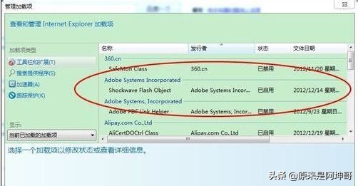 2、或者打开浏览器,将Flash插件的启动项启用,系统默认是启动的,但也不排除操作过程中不小心关掉的可能,我们以IE为例,点击设置,打开管理加载项