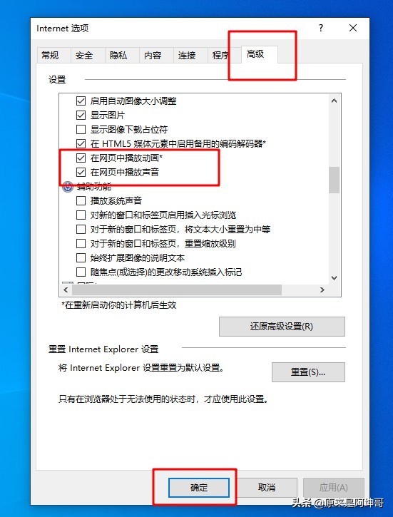 2、 点击切换到“高级”菜单中,下拉滑动条,将“在网页中播放动画”和“在网页中播放声音”这两项前面打上勾,点击确定后重新启动IE浏览器即可