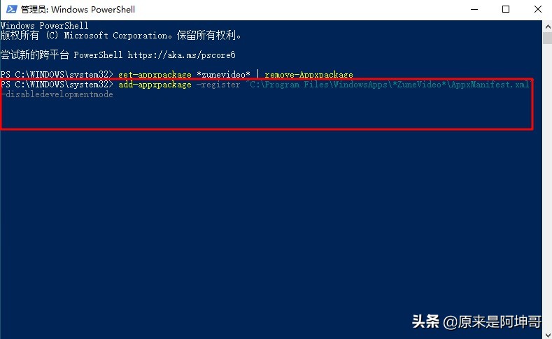 6、然后,再输入“add-appxpackage -register “C:\Program Files\WindowsApps\*ZuneVideo*\AppxManifest.xml” -disabledevelopmentmode”即可再次安装