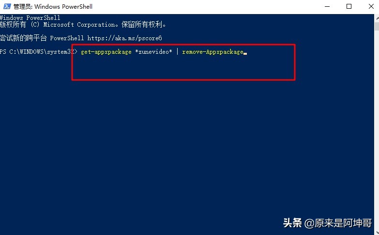 5、输入“get-appxpackage *zunevideo* | remove-Appxpackage”并回车即可卸载播放器