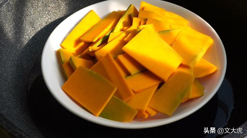 1、首先准备1块南瓜,去皮后是350克,然后切成薄片,放入锅里蒸熟。