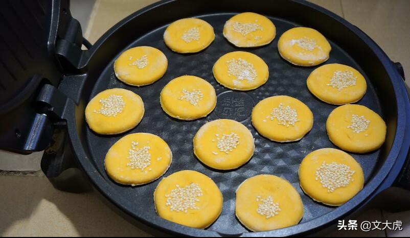 7、电饼铛不用刷油,直接放上发好的小饼,关上盖子小火烙5分钟。