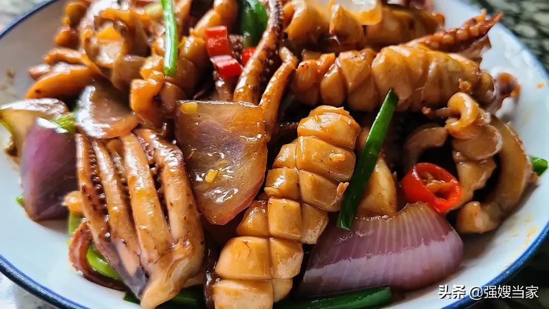 5,爆炒鱿鱼,因为鱿鱼腥味比较重,所以得多放点生姜、大蒜、洋葱、小米辣等一起炒,这样搭配不但香,而且去腥。