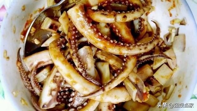 2,爆炒鱿鱼时,别直接下锅炒,即便是泡发好的鱿鱼,也不能直接下锅炒。因为鱿鱼下锅容易炒熟,如果直接下锅炒再进行调味,那么鱿鱼很难入味。而正确的方法是:先把鱿鱼腌制入味,再下锅爆炒,这样鱿鱼不但入味,还能最大程度地保留鲜香味。