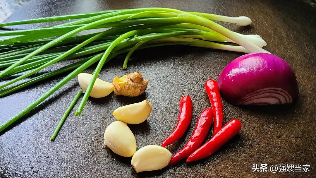 5,这时候,我们准备好配菜,把生姜、大蒜、洋葱、辣椒、小葱全部洗干净备用。把生姜切丝,大蒜切片,小米辣切圈,洋葱切成小块,小葱切成葱花。