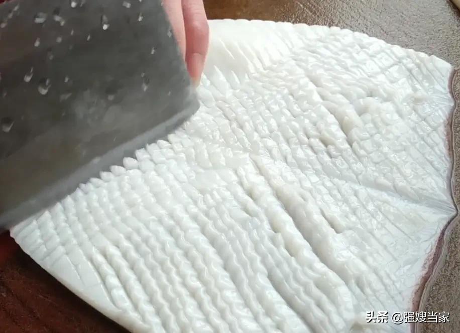 3,把鱿鱼平铺在案板上,用菜刀呈45℃角切花纹,一般切的时候只是轻轻划几刀,呈X型划花刀,然后切成小块。