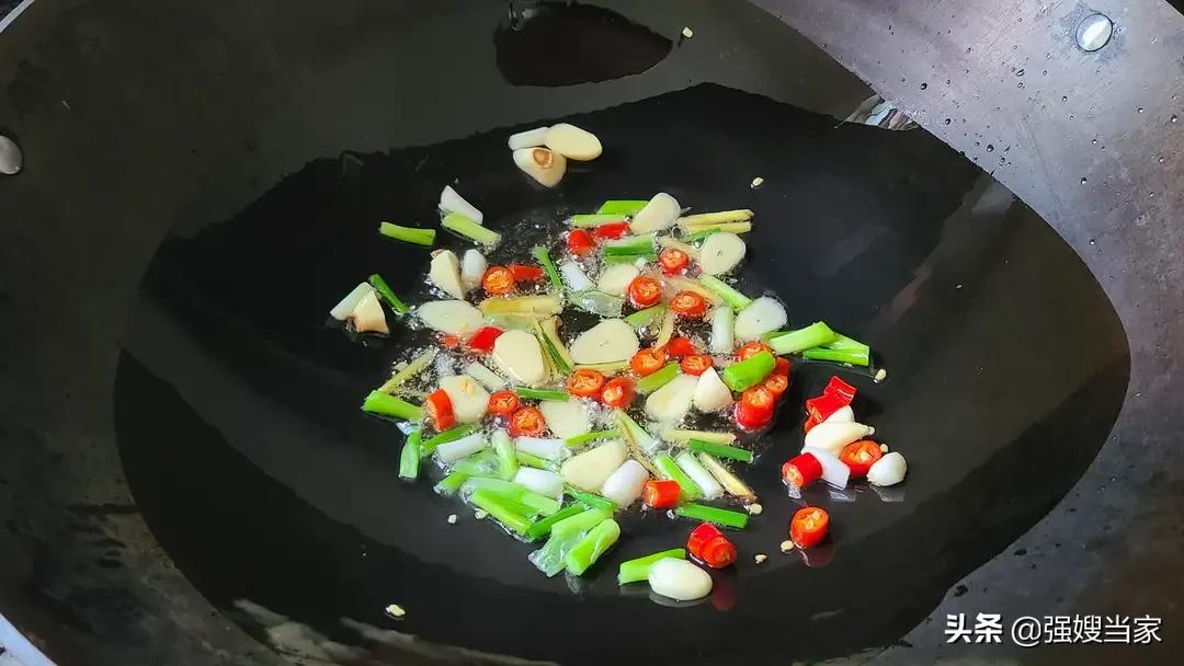 6,起锅倒油,放入切好的配菜,爆出香味。