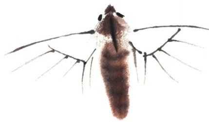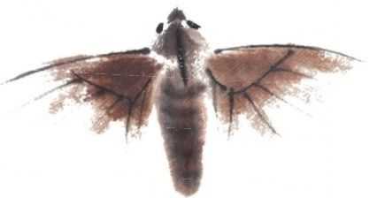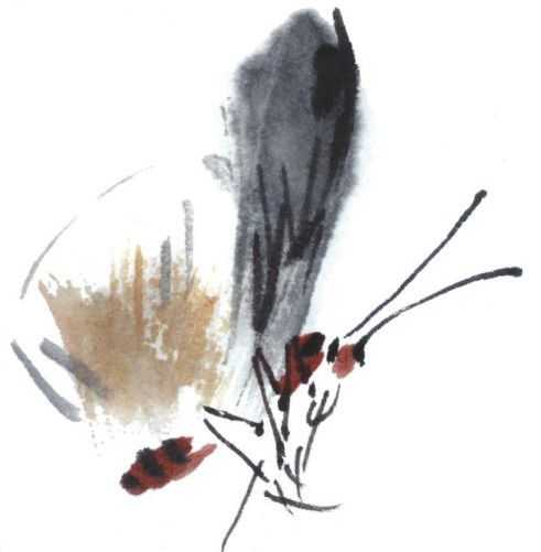 6 用赭石和少许墨色调和,绘出双翅,保留其自然飞白。