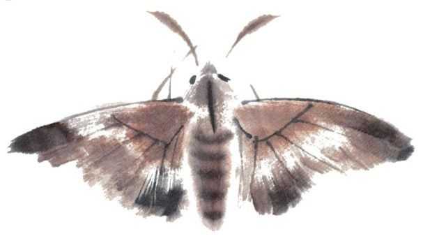 蛾与蝴蝶是非常近似的一类昆虫,头部一般较小,但是黑黑的复眼很大,虹吸式口器也比蝴蝶粗大,全身绒毛浓密。身体粗大肥壮,羽状触角较粗长,飞行力弱,一般在夜间飞行;静止时翅呈屋脊状,正面多灰褐色、淡黄色、白色等,深色的较少。画蛾时用笔要轻巧灵动,翅要注意脉络,花斑要对称,不可过于死板或呈图案状。