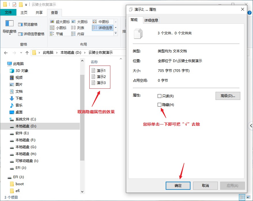 在属性窗口里,点击“隐藏”功能前面的小方框,把“√”取消掉,最后点击“确定”选项,隐藏的文件夹数据就能恢复正常了。