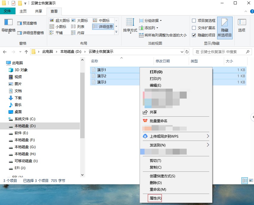 然后我们把文件夹数据的隐藏属性取消掉,使用ctrl+a全选快捷键将数据全选上,鼠标右键单击后点击“属性”,打开属性窗口。