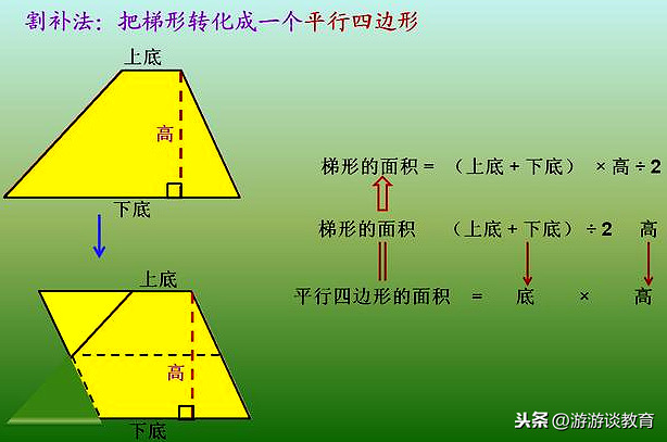梯形的面积,公式推导其实和平行四边形面积、三角形面积的推导方法类似,都是遵循以“旧”导“新”的原则展开的。说到底,就是在我们学习“新知”的时候,一定要联系“旧知”,用“转化”的思想进行知识的迁移。有了这个方法,许多看似较难的问题都能迎刃而解。