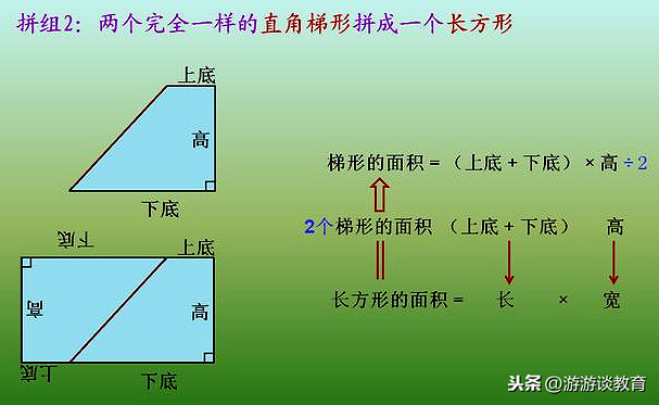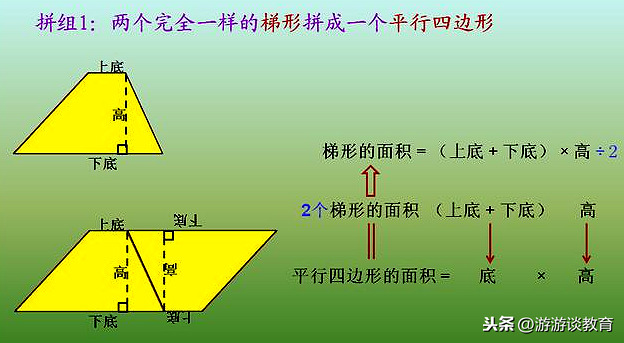 把2个完全一样的梯形,进行方向的调整后,拼组成一个大的平行四边形。这时,平行四边形的底=梯形的上底+下底,平行四边形的高=梯形的高,而平行四边形的面积=底×高,即(梯形的上底+下底)×高,又因为这个大平行四边形面积是梯形面积的2倍,因此,平行四边形的面积 =2个梯形的面积=(上底+下底)×高。由此推出:一个梯形的面积=(上底+下底)×高÷2。