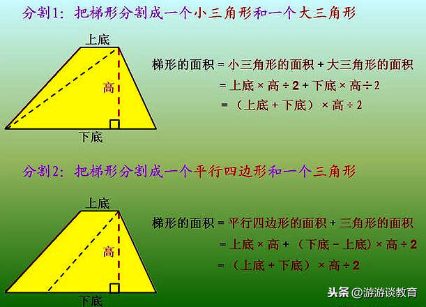 从梯形上底的一个顶点,往下底的一个顶点作对角线,这个对角线把梯形分割成了一个小三角形和一个大三角形。两个三角形的高都是一样的,而小三角形的底是梯形的上底,大三角形的底是梯形的下底,因此小三角形的面积=上底×高÷2,大三角形的面积=下底×高÷2,从而推出:梯形的面积=小三角形的面积+大三角形的面积=上底×高÷2+下底×高÷2=(上底+下底)×高÷2。
