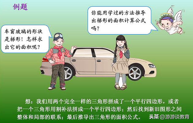 前面,我们用转化的方法推导出来平行四边形、三角形的面积计算公式,这里,同样可以用转化的方法,把梯形转化成已学过的图形,来推导梯形的面积计算公式。本课还是以“解决问题”入手,通过解决“车窗的玻璃形状是梯形,怎样求出它的面积呢?”这个问题,从而引出下面5种方法来推导梯形的面积计算公式。