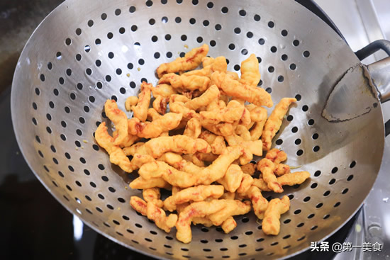 2.里脊肉一定要经过二次复炸,口感才更加焦酥,不易回软。