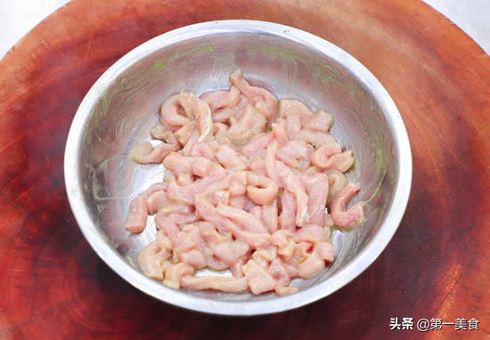 3.在切好的肉条中,加入少许食盐增加底味,多次少量的倒入一半的葱姜汁,每一次 都要把葱姜汁搅拌摔打至完全吸收,这样既能去除腥味又能让里肉吸收水分变得嫩滑,搅拌至肉条出胶放在一边腌制10分钟。
