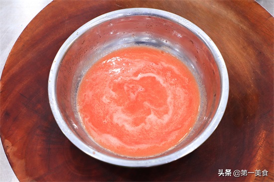 番茄汁本身有一定酸味,醋要稍微少放一点,白糖30克,其中糖和醋的比例为1:1,这样酸甜味比较均衡,不会相互压制。