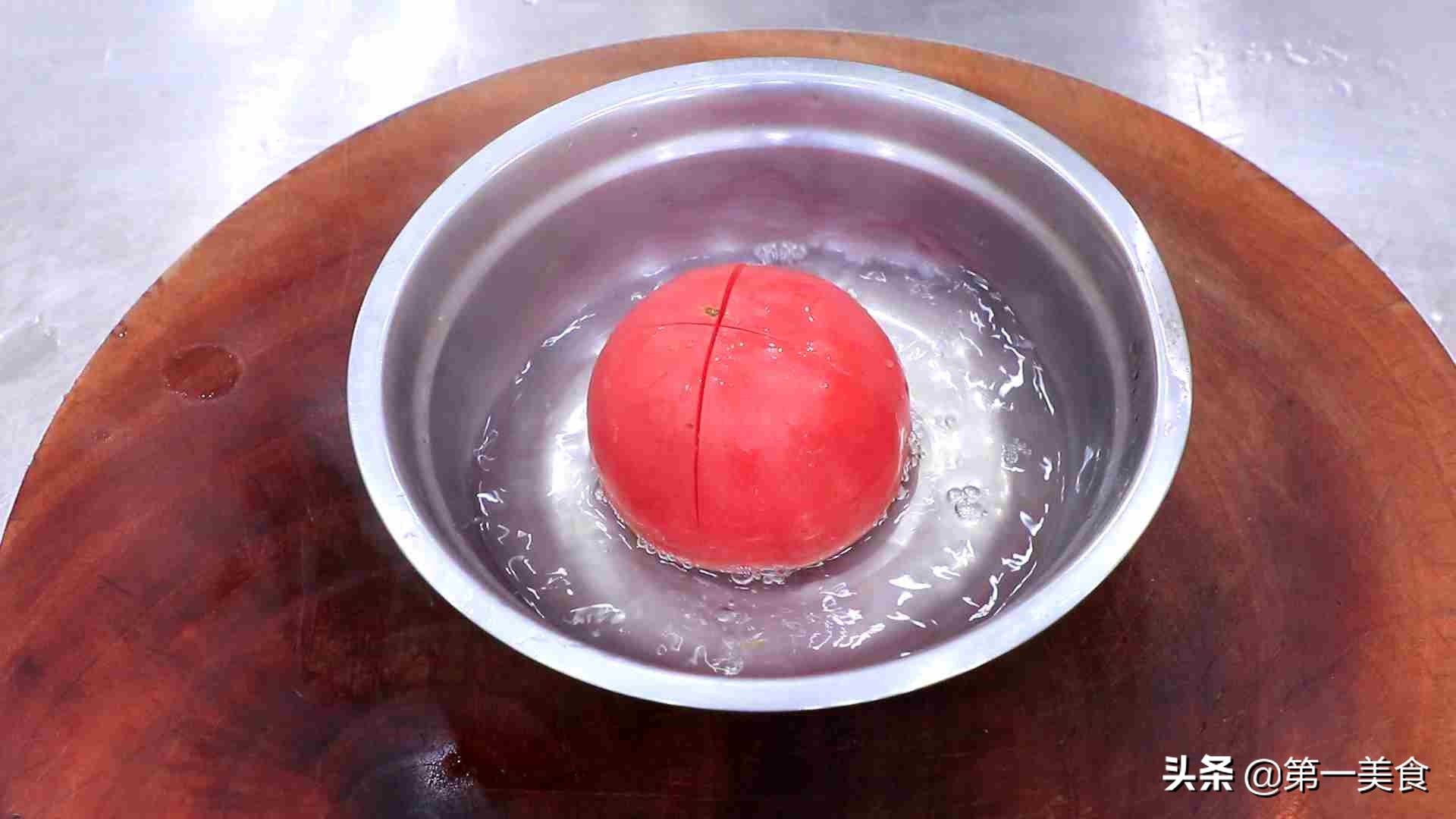 6.把番茄打上十字花刀,放入开水中烫一会,烫破皮以后取出来揭掉外皮切成番茄丁,把番茄丁倒入料理机中,少加一点清水打成汁,筛出里面的番茄渣我们只用番茄汁。