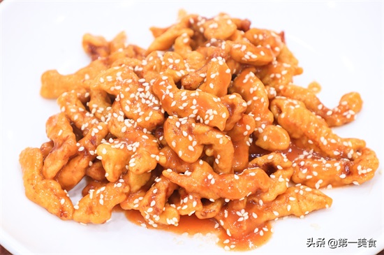 9.锅内留少许底油,倒入准备好的糖醋汁,大火烧开以后勾入一点水淀粉,把糖醋汁收成粘稠状,然后倒入炸好的里脊肉快速颠锅翻匀后立即出锅。撒上炒熟的白芝麻就可以上桌食用了。