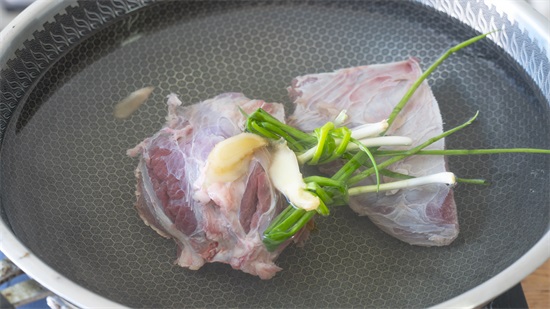 2、洗好的牛肉冷水下锅焯水,加葱结、姜片、料酒去腥,煮开后撇去浮沫,再捞出来沥干水分备用。