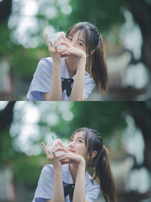很多人觉得对半构图或中心构图会稍显呆板,但实际上这两种构图方式能巧妙地运用光影和色彩,在拍半身照时,采用横屏拍摄,上下、左右对半都可以,结合光影和虚化的艺术,拍照很有电影MV的既视感。