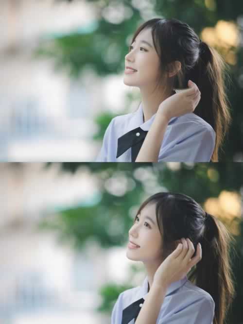 如果拍的是半身照,那么上半身的姿势可以丰富有趣一些,做做鬼脸、搞怪一下,或者像模特一般,双手举起放在头顶,为人像制造出更多的三角轮廓,丰富人像的立体感和层次感。