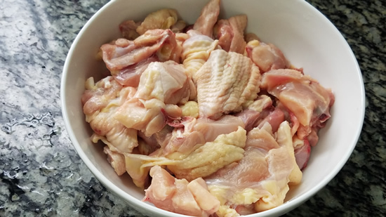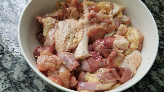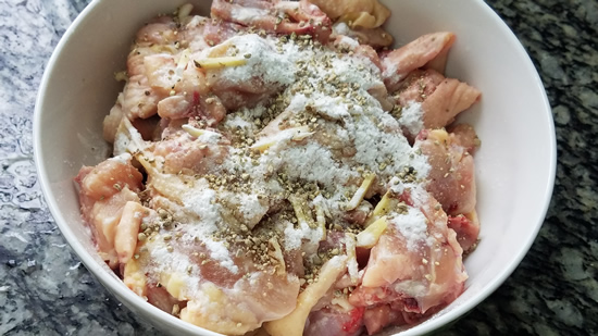 1.买半只鸡回来,把它清洗干净后斩成小块,稍微沥干水分装入盘中。现在来腌制一下鸡肉,放入半勺盐、少许姜丝、一勺生粉、一点点花生油、2小把的胡椒碎,用胡椒粒压碎就成了胡椒碎了,不要用胡椒粉,不然味道太淡了。把它们全都搅拌均匀,然后腌制30分钟,腌制的时间长一点就更加入味一点。