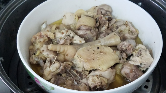 2.腌制的时间到了,稍微翻动一下鸡肉,把鸡肉放入烧开的蒸锅里面,盖上盖子,开中小火蒸30分钟,蒸的时间越长就越能充分的把胡椒的味道蒸出来。如果想要熟得更快,可以把鸡肉平铺在一个大盘子里面蒸。