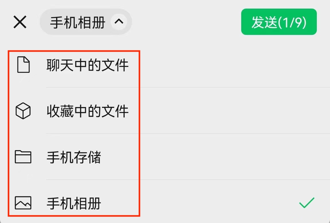 我们可以从4个渠道选择文件,找到客户需要的视频,勾选后直接点击【发送】,这是