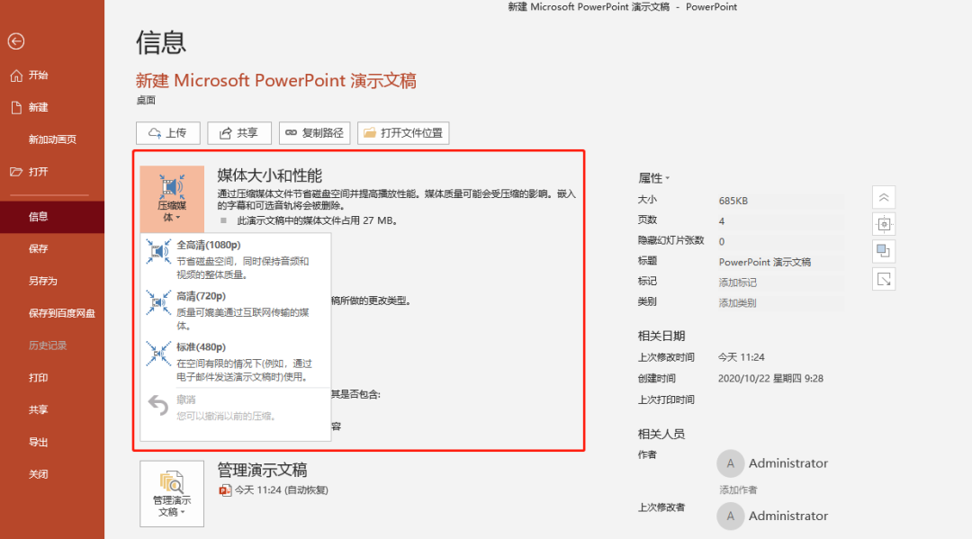 如果客户对画质没有要求,你可以将视频压一下,也能发送出去。直接打开PPT插入视频,然后点击【文件】—【信息】—【媒体压缩】。