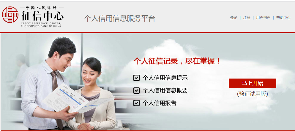https://ipcrs.pbccrc.org.cn/)打开并进入。个人信用信息服务平台的首页就有明显的查阅入口“点击马上开始”,首次使用需要注册;注册成功后,你就可以选择想要查询的信息了。