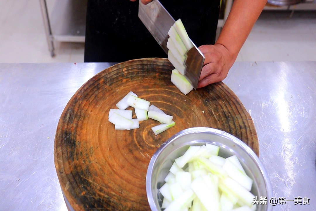2.冬瓜一节,把外皮削干净,切成小块,然后去除瓜瓤,把冬瓜切成片,放入清水中洗干净。