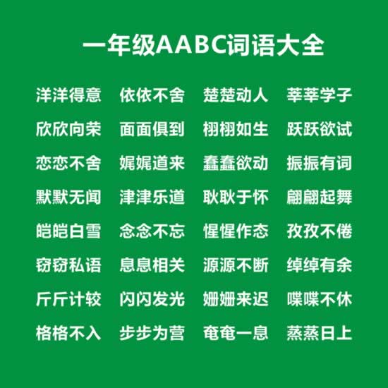 一年级我们开始接触AABC式词语,AABC词语是前两个字相同,后两字不同的四字词语。我们在一年级开始学AABC词语,并且在整个小学阶段不断积累学习,在以后我们的造句,写作等都会有很大帮助。