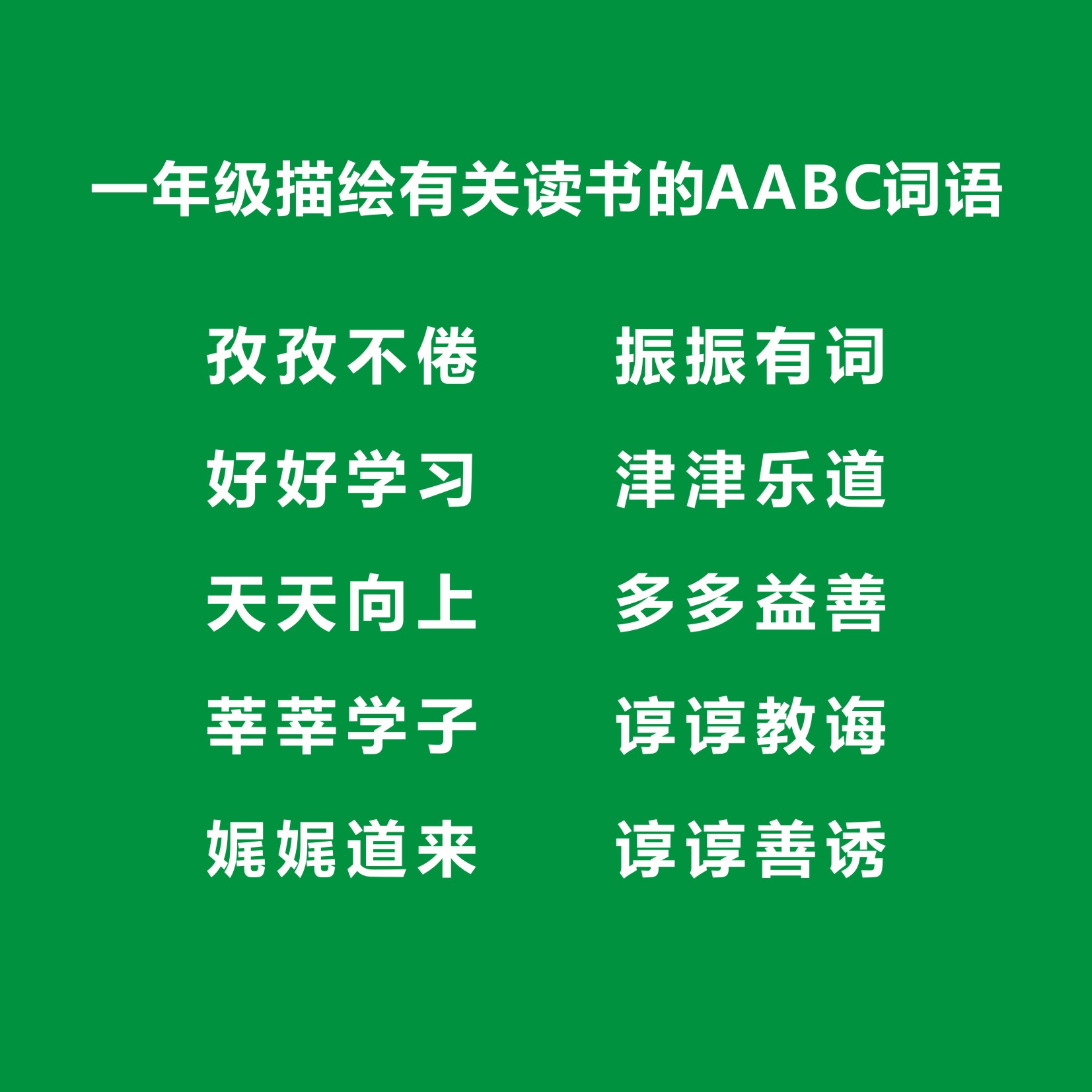 :描绘有关读书的AABC词语,一年级常用的有好好学习,天天向上,津津有味,莘莘学子,多多益善,振振有词,孜孜不倦,娓娓道来,津津乐道等,制作图片分享给大家。