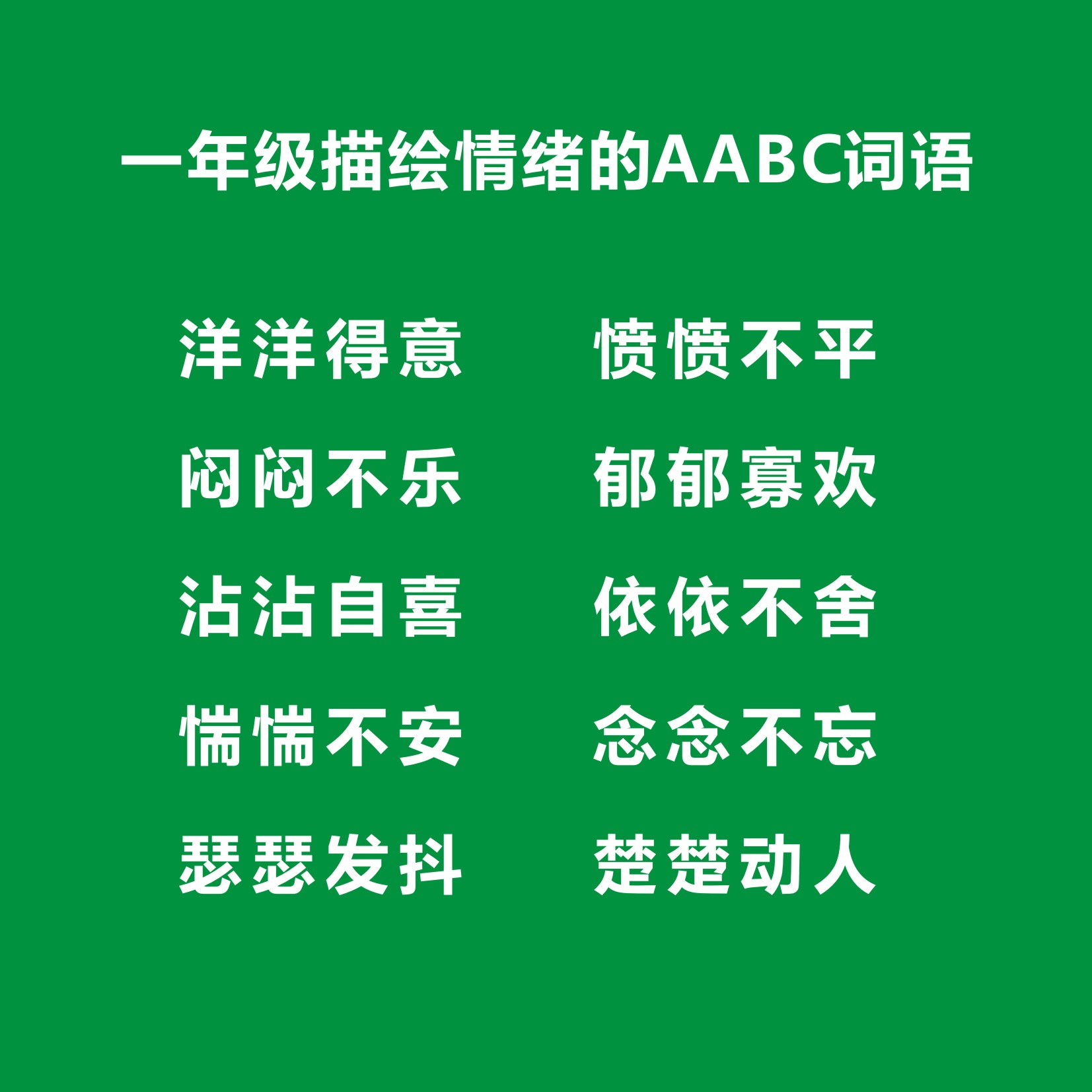:描绘情绪的AABC词语,一年级常用的有洋洋得意,愤愤不平,闷闷不乐,郁郁寡欢,恋恋不舍,沾沾自喜,念念不忘,依依不舍,惴惴不安等。制作图片分享给大家。