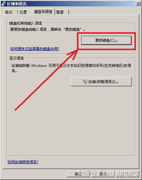 1、依次点击:【开始】—【控制面板】—【区域和语言】—【更改键盘和其他输入法】—【更改键盘】