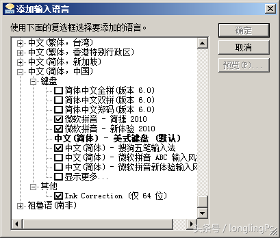如果输入法被删除了,那么你的”文本服务和输入语言”对话框中”键盘”下面就不会有输入法显示,而这也是导致你的Win7输入法不见了的原因,点击上图右边的”添加”按钮,然后会弹出下图”添加输入语言”对话框来添加输入法后就可以解决了。