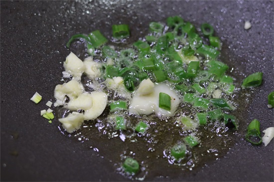 3、加入一些小葱碎炒出香味,这道菜最好别放大蒜,吃的就是油菜花的清香味。