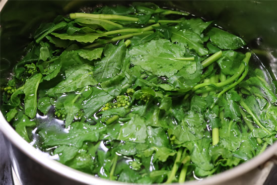 1、油菜花清理干净,只选用春天刚抽出来的嫩茎和叶子,花蕾也可以吃,锅中加水,加入少许盐和油,烧开后将油菜花放入焯水半分钟捞出控水备用。