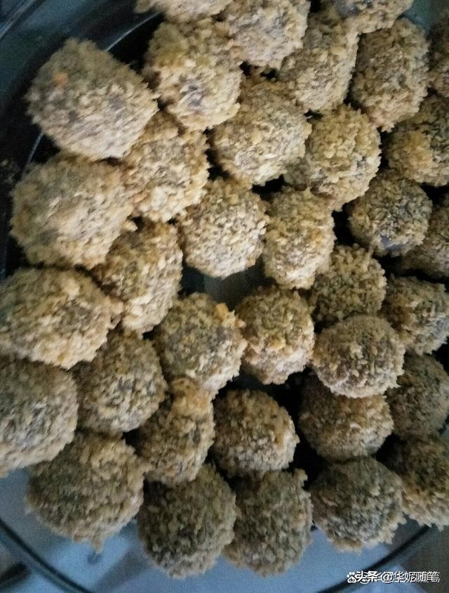 把面包糠倒入盘中,然后把裹有蛋液的汤圆分次倒入面包糠中,用勺子翻动一下,让每个汤圆都均匀地裹上一层面包糠,放入大盘中备用。全部裹好后就可以开始炸汤圆了。