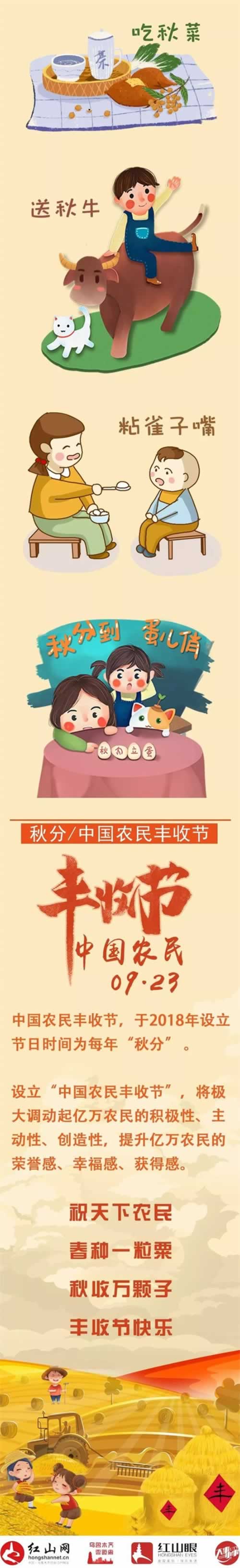 经党中央批准、国务院批复自2018年起,将每年秋分日设立为“中国农民丰收节”,这是第一个在国家层面专门为农民设立的节日。所以今年的秋分,也是我国第二个“中国农民丰收节”。
