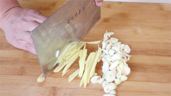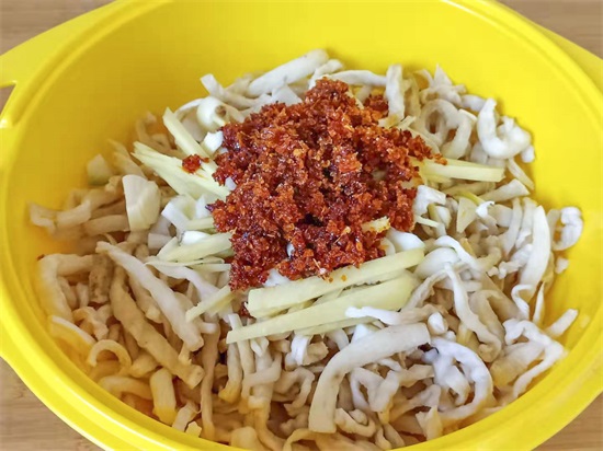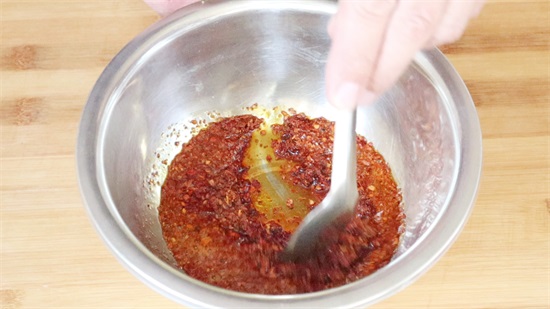 3. 切点大蒜,切点姜丝,盆中倒点辣椒面,用热油喷出香味,加盐,加点白糖,搅拌均匀。