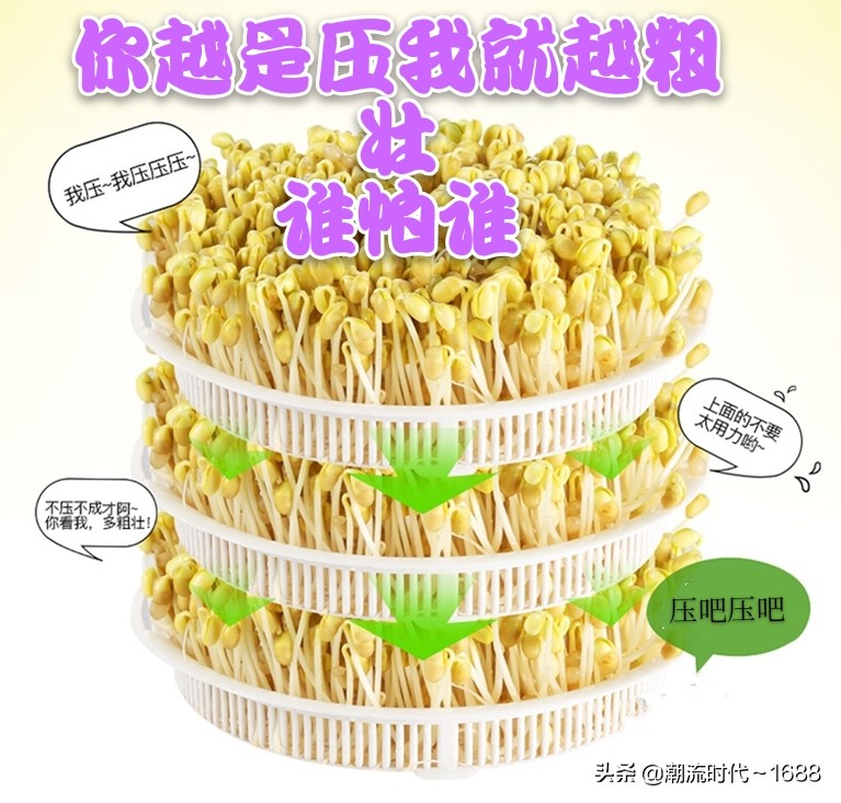 如今市场上也早就有了各种大大小小型号专业用来种芽菜、发豆芽的机器出售,有资金的话,可以买机器回来自己种植豆芽菜了。