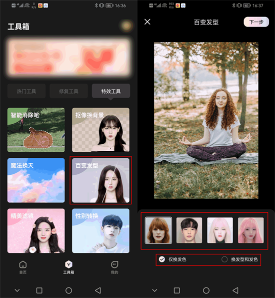 这款软件里面的百变发型特效,就可以帮助我们对真人照片进行换发想操作,并且软件里面还提供了16种发型模板供我们选择,我们除了可以换发型还可以进行换发色,很好的满足了我们多样化的需求。