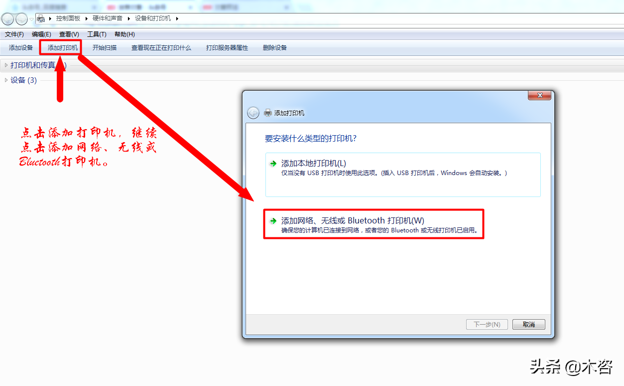 ②点击添加打印机,点击添加网络、无线或者Bluetooth打印机。