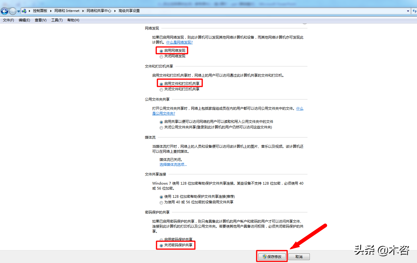 ⑥分别选中“启用网络发现”、“启用文件和打印机共享”、“关闭密码保护共享”后,点击保存修改。